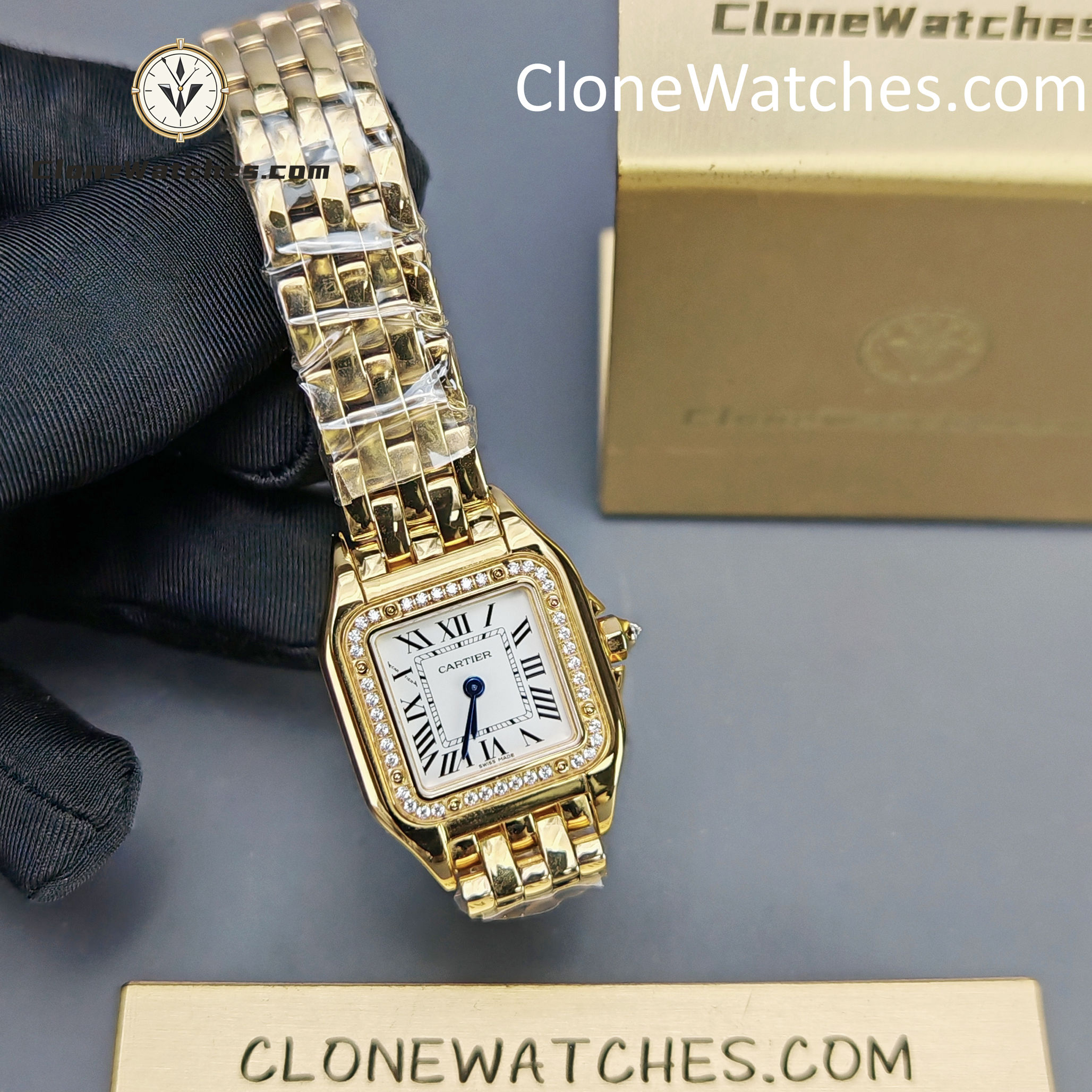 Experience timeless elegance with the Cartier Panthère de Cartier WJPN0067 Super Clone Watches 1:1, featuring a white Roman dial, quartz movement, and a polished 18K yellow gold bracelet. The 22mm x 30mm case highlights Cartier’s signature square design and diamond-set bezel, blending sophistication and precision. A flawless luxury replica crafted to mirror the original in every detail.