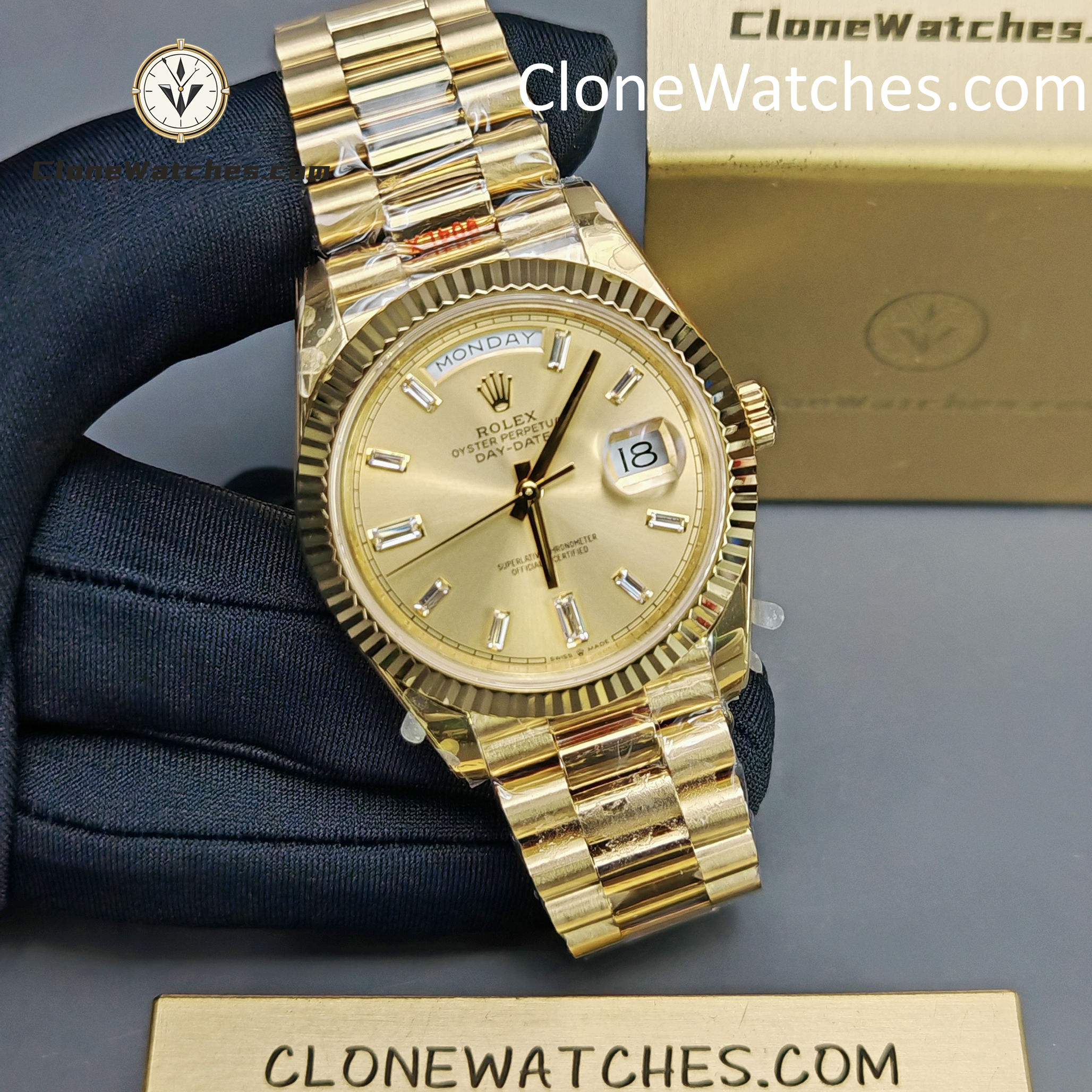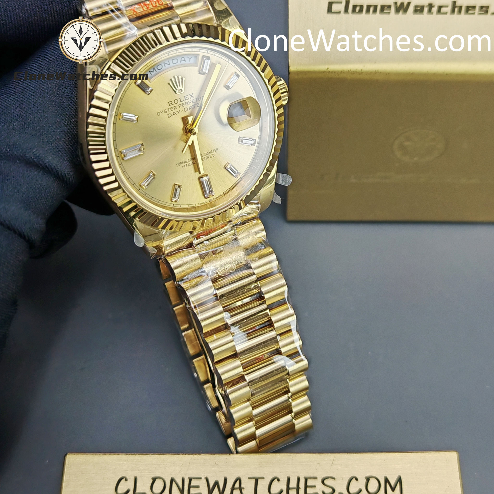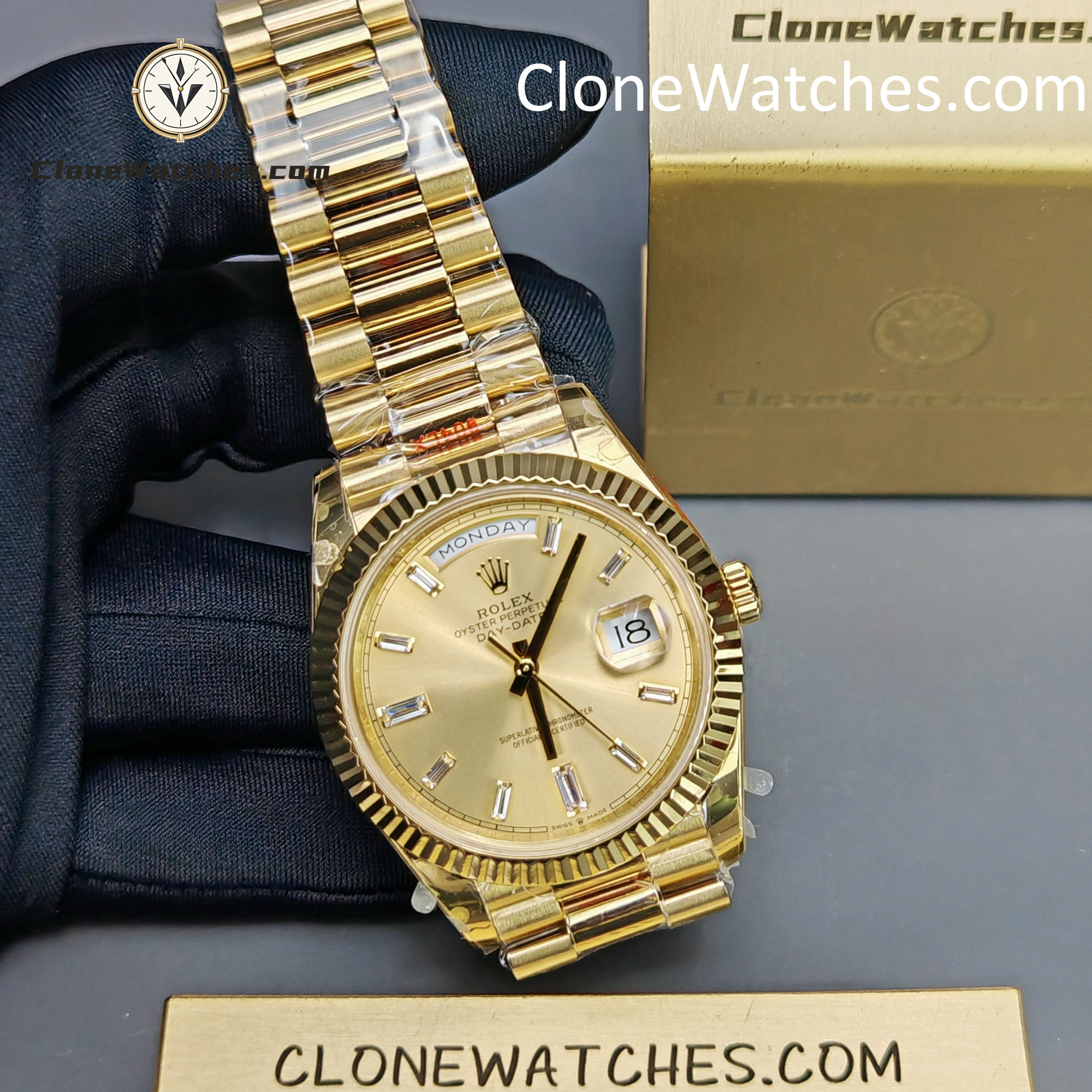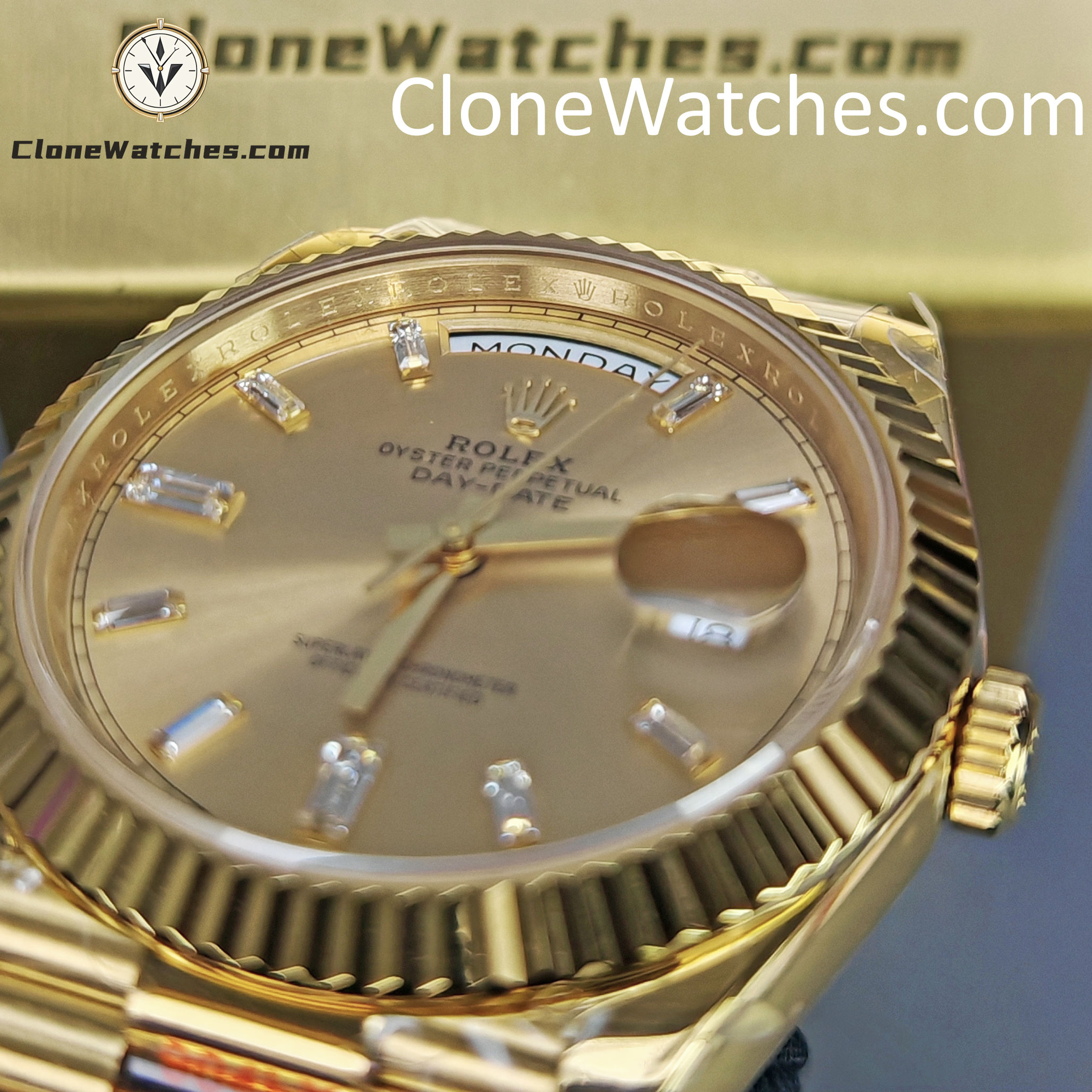 Rolex Super Clone Watches 1:1 Day Date 18K Gold Diamond Dial 40mm m228238-0005 3255 Movement