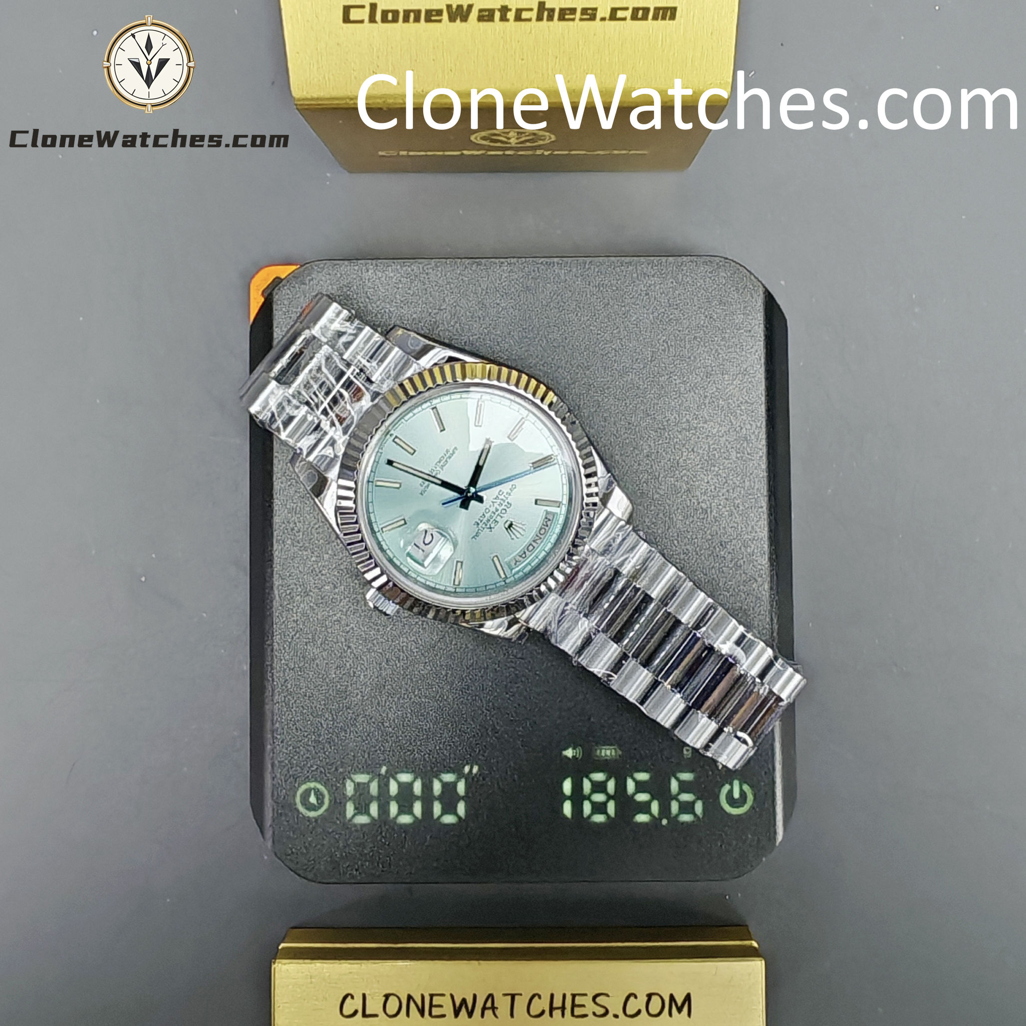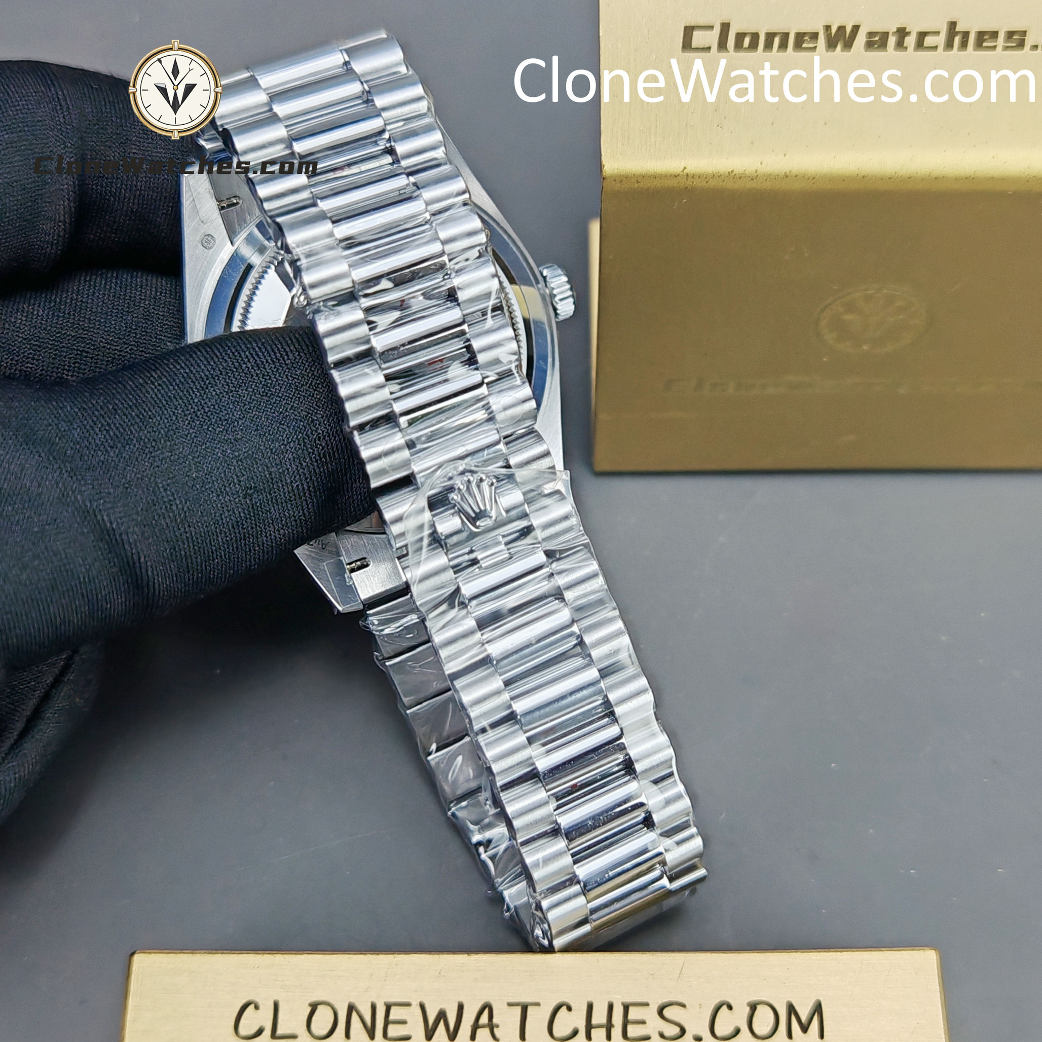 Front Crystal Made Of Sapphire, making this Rolex Super Clone Watches Day-Date 40mm scratch proof. Laser etched Rolex crown present at 6’O clock on the crystal